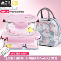 三维工匠微波炉饭盒套装学生分隔玻璃加热碗保鲜盒上班族保温便当餐盒日式 [北欧粉]圆650+两隔长680+火烈鸟包+餐具