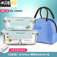 三维工匠微波炉饭盒套装学生分隔玻璃加热碗保鲜盒上班族保温便当餐盒日式 [北欧蓝]长410+两隔长680+包+餐具