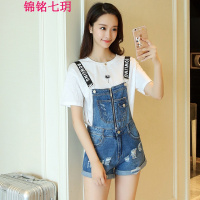 锦铭七玥夏季新款女士牛仔背带裤2017时尚休闲破洞牛仔裤短裤女式背带装潮
