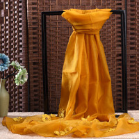 女秋冬季优雅桑蚕丝羊毛围巾手工钉珠空气感丝巾丁香结-姜黄175-230cm
