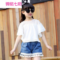 锦铭七玥童装女童套装夏款2017新款韩版棉短袖T恤流苏牛仔裤大童两件套装