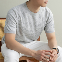 老钱风天丝亚麻针织短袖男T恤2026夏季新款圆领纯色提花男士T恤