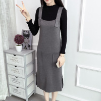 薇侣2017新品实拍秋冬双口袋中长款包臀连衣裙女针织背带裙