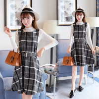 薇侣2017格子背带裙+针织长袖打底衫两件套连衣裙