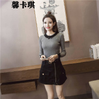 薇侣2017秋季新款韩范小香风蝴蝶结条纹撞色套头针织衫长袖t恤上衣女