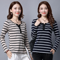 薇侣2017新品韩范休闲修身显瘦横条纹长袖t恤女中长款打底衫