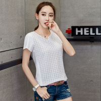 薇侣2017新品3314#实拍现货纯棉拼接纱网棉小V领短袖T恤女文艺范大码女装