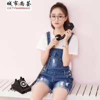 新款无弹翻边割破水洗青少年装牛仔背带短裤女