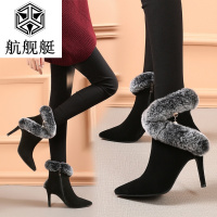 真皮靴子女 短靴女 性感尖头细跟高跟獭兔毛毛靴牛反绒磨砂棉靴鞋