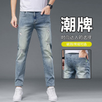 男士渐变破洞休闲牛仔裤男柔软高弹大码合身潮流透气百搭修身长裤