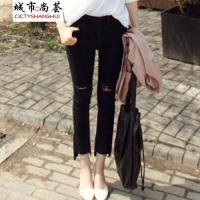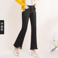 2018新款黑色牛仔裤女时尚显瘦九分裤棉弹蕾丝毛边微喇裤黑色