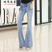 2018春装新款牛仔裤女韩版弹力修身流苏毛边微喇裤长裤子CYLLSD