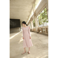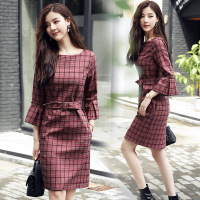喇叭袖套头高腰圆领长袖中长款H型连衣裙2017年秋季时尚修身p85
