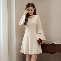 2017秋装新款V领喇叭袖纯色长袖收腰连衣裙女韩版P75