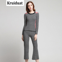 eosciy/Kruidvat2017欧美女装春季新款千鸟格套装针织上衣直筒裤貂绒两件套女