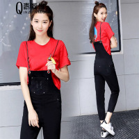 步来褶惠夏季新圆领短袖纯色T恤女式背带裤两件套休闲套装新夏