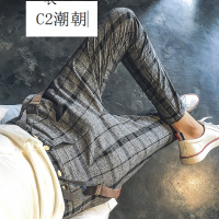 C2潮朝网红快手天佑弹力秋冬格子西裤休闲背带裤韩版修身休闲裤灰色