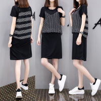 薇侣2017新品韩版胖mm夏装新款200斤显瘦条纹雪纺棉混纺连衣裙假两件