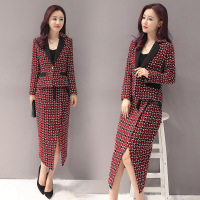 莞馨(wanxin)新款秋韩版休闲职业套装女格子短款西装风衣外套开叉包臀半身裙两件套
