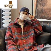 YANXU法兰绒红色格子衬衫男长袖oversize衬衣日系复古工装毛呢外套