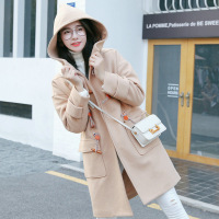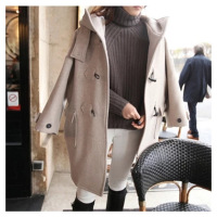 莞馨(wanxin)韩国毛呢外套女2016秋冬新款中长款学院风宽松连帽牛角扣呢子大衣