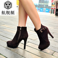 清仓高跟短靴子女靴真皮及踝靴防水台牛反绒裸靴夜店宴会鞋
