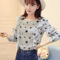 珂依舍2017秋装新款2017秋季新款女装宽松t恤韩版印花荷叶边长袖雪纺衫
