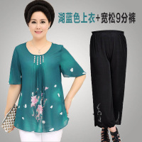 中老年女装短袖雪纺衫夏装套装中年人上衣+裤子大码妈妈装两件套湖蓝色上衣+宽松黑色9分裤