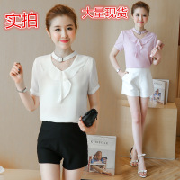 薇侣2017新款夏装大码女装胖mm短袖印花雪纺衫蝴蝶结上衣T恤