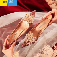 聚范婚鞋秀禾服婚纱两穿水晶鞋新娘鞋女红色尖头高跟鞋粗跟不累脚单鞋