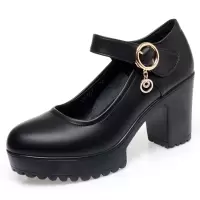 新款防水台皮鞋女时尚防滑走秀鞋女高跟粗跟圆头大码黑色女工作鞋