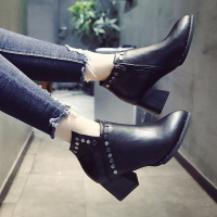 铆钉尖头马丁靴粗跟冬季新款女短靴单靴粗跟加绒高跟鞋及裸靴