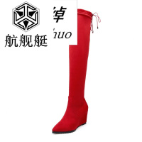 秋冬季欧美风磨砂尖头坡跟高筒靴女单靴过膝靴长靴瘦腿弹力靴女鞋红色40大码订做加绒