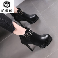 性感铆钉细跟短靴防水台侧拉链马丁靴冬季新款加绒女靴夜场高跟鞋