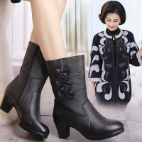 新款妈妈鞋真皮中筒靴粗跟中跟中老年女靴保暖加绒雪地棉靴中靴冬