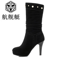 绒面中筒靴冬季新款女靴防水台加绒细跟中靴性感显瘦高跟女鞋棉靴子黑色