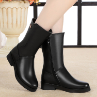 冬季真皮女靴平跟中筒靴平底妈妈靴子中年中靴中老年女士羊毛棉靴