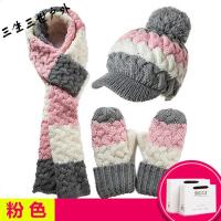 围巾帽子手套三件套件围巾女冬天韩版潮甜美可爱撞色毛线帽针织帽粉色均码