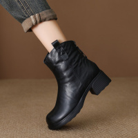 头层牛皮短靴女冬季新款西部靴复古百搭保暖绒里粗跟拉链女靴