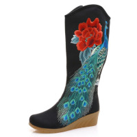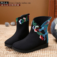新款中高跟老北京布鞋民族风绣花鞋坡跟中国风高筒绣花女靴布靴子