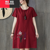 YIBUSHENG2022季新款棉麻宽松大码女装装遮肚短袖显瘦中长款绣花连衣裙