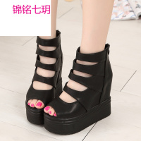 锦铭七玥坡跟鞋女凉鞋2017防水台厚底新款欧美镂空凉鞋鱼嘴鞋