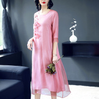 复古中国风立体花真丝欧根纱连衣裙纯色圆领桑蚕丝长裙2018新款CYLLREVIENNE