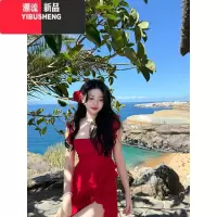 YIBUSHENG2023新款雪纺红色碎花吊带连衣裙女裙子显瘦三亚海边度假沙滩裙