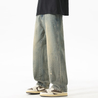复古蓝做旧泼墨牛仔裤男宽松阔腿直筒裤高街潮牌水洗牛仔长裤男生