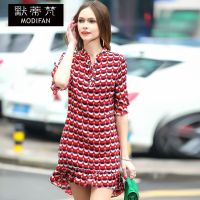 默蒂梵2017春夏女装新款欧美波点印花修身鱼尾双绉真丝连衣裙红色