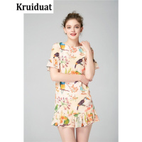 Kruidvat2017夏季新款女装印花真丝双绉连衣裙喇叭袖荷叶边LLFS花色