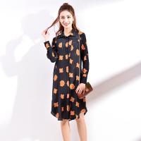 镂空织花双绉真丝连衣裙时尚印花中长款桑蚕丝衬衫裙长袖A字裙
