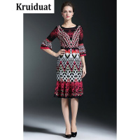 Kruidvat2017早春新款优雅气质七分袖过膝印花宽松鱼尾裙女