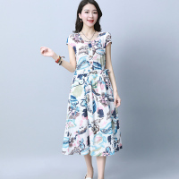 步来褶惠中腰圆领花色连衣裙2017年夏季短袖中长款大摆型单件套头连衣夏